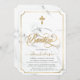 Convite de Batismo moderno e elegante com fundo de mármore branco, cruz dourada elegante, tipografia de Batismo em letras douradas da moda. Para editar este modelo, clique em personalizar ainda mais.