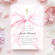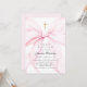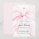 Convite de batismo coquete que apresenta um laço rosa elegante e uma cruz dourada.