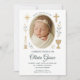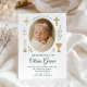 Celebre o dia especial da sua bebê com este convite de batizado elegante e personalizável. Apresenta uma paleta de cores neutras suaves com símbolos religiosos em ouro desenhados à mão — cruz, vela, cálice — e uma moldura de foto oval centralizada. Um design atemporal perfeito para cerimônias modernas ou tradicionais.