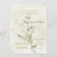 Celebre um momento sagrado com este cartão de batizado elegante com um pombo branco suave rodeado por elementos botânicos dourados e prateados em um fundo texturizado cremoso.