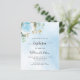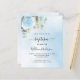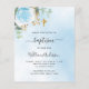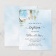 Um fundo de céu azul decorado com folhagem de eucalipto, uma rosa azul clara e folhas douradas. Personalize com o nome da criança e detalhes da cerimônia. Letras pretas e douradas.