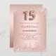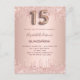 Um convite moderno, elegante e glamoroso para a festa de Quinceañera de uma menina, festa de 15 anos. Um fundo de ouro rosa com respingos de ouro rosa, visual de tinta pingando. O nome é escrito com um estilo de letra manuscrita moderna em cor de ouro rosa escuro. Personalize e adicione os detalhes da sua festa. O número 15 é escrito com uma fonte estilo balão, manuscrita.