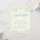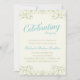 Um convite sofisticado para a sua festa de bodas de ouro de 50 anos. Um texto elegante em letra cursiva diz "Comemorando 50 anos" em um lindo tom de azul turquesa. Belas espirais douradas ao longo da parte superior e inferior do convite enquadram o texto.