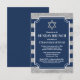Este convite tradicional de Brunch de Bar Mitzvah de domingo em azul marinho e listras cinzas tem uma área de texto em forma de bilhete que é cortada em branco. Há uma grande Estrela de David cinza acima da redação. O verso pode ter redação adicional se necessário. Envie um e-mail para niteowlstudio@gmail.com com qualquer pedido de alterações.