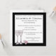 O convite do buffet de coquetel apresenta uma ilustração caprichosa de Donna Gotlib de dois copos de vinho e flores cor-de-rosa em um pequeno copo. Há uma ampla borda preta ao redor do convite, que é de um branco crocante. A fonte tipográfica é um design de impressão de caligrafia divertido e caprichoso.
