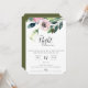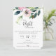 Convite de celebração da Noite Anterior. O cartão apresenta um elegante buquê floral de jardim em tons elegantes de branco, roxo e verde. Design de tipografia moderno e sofisticado.