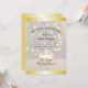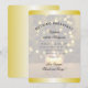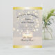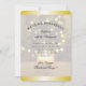 Convite de casamento de Natal com bordas douradas e inversas. Uma árvore cintilante e uma imagem de vela são o fundo para uma tipografia moderna com o texto curvo "café da manhã de casamento" no topo. Abaixo, convida convidados especiais para jantar com os recém-casados e deseja-lhes "boa viagem" em sua lua de mel.