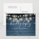 Um cartão de RSVP rústico com lindas luzes de corda e tipografia elegante sobre um fundo de painéis de madeira azul. O verso apresenta seus detalhes e um divertido pedido de música para os convidados. Criado por Thisisnotme©