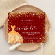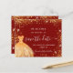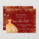 Um convite de Save the Date feminino e moderno para uma festa de aniversário de Sweet 16. Um fundo vermelho elegante decorado com brilhos dourados de purpurina falsa e um vestido. Personalize e adicione uma data e nome/idade. O texto: Save the Date é escrito com um estilo de letra manuscrita moderna e grande.