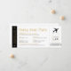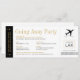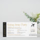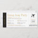 Um convite de festa de despedida exclusivo com um tema de viagem em preto e branco e dourado, que parece um cartão de embarque ou passagem de avião com um modelo simples com um ícone de logotipo de avião no canto. As cores e fontes são editáveis para que você possa combinar com o esquema da sua festa ou com a decoração do local da sua festa de despedida.
