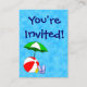 Um modelo de bilhete de evento ou convite personalizado no tamanho de cartão de visita com arte de um guarda-sol de piscina e bola de praia em azuis aguados. Personalize-o para adicionar seu nome ou mensagem, e até salve seu design para mais tarde.