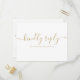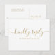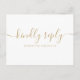 Um cartão de resposta com uma assinatura elegante em ouro e tipografia chic. O verso contém as informações do casamento e um pedido de música para os convidados. Desenhado por Thisisnotme©
