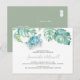 Convide os convidados para o jantar de ensaio com meu convite de cartão postal tropical. O design apresenta minha tartaruga marinha original em aquarela e folhas de palmeira monstera em tons de verde, turquesa e azul. Seus nomes são definidos em uma tipografia moderna de letra manuscrita. O cartão reverte para uma cor verde sage complementar com espaço para o endereço do convidado e detalhes adicionais. Para ver o conjunto de convites correspondente, visite www.zazzle.com/dotellabelle
