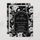 Um padrão floral de rosa preto e branco muito elegante cria um modelo de convite de cartão postal de aniversário de 21 anos. O texto e a caligrafia brancos são emoldurados por um arco preto com bordas brancas. Este item faz parte da Coleção Floral de Rosa Preta e Branca. Ele contém modelos para criar um conjunto de convites único, sinais de boas-vindas e decorações de festa.