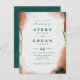 Convites de Casamento Abstratos em Aquarela Etérea em Verde Teal Escuro e Cobre. Este convite de casamento moderno é embelezado à mão com cores ricas que são perfeitas para o Outono. Mostrado na paleta de cores de casamento em Teal Escuro: Verde Pavão Teal Escuro, Ferrugem de Cobre, Ouro Empoeirado, Bosque de Amêndoas e Bege Bisque. Com detalhes de folha de alumínio glitter metálico falso e uma fonte de script com caudas, a coleção de casamento em aquarela etérea certamente tornará seu casamento memorável e lindo!