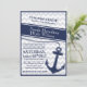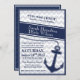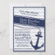 Convites de casamento em azul e branco com marinho de fêmur náutico - o design da frente é composto de uma faixa e ancora em uma corda. Os designs, texto e contornos estão em azul marinho com um fundo chevron branco. Na parte de trás está uma âncora branca maior que está sobre um fundo de fêmur azul marinho. Por padrão, o papel é definido como estoque básico de convites, mas pode ser alterado clicando em 'escolher seu estilo' e, em seguida, usando a caixa suspensa Papel, selecione uma das opções. Cada convite vem com um envelope branco. Para alterar a fonte, o tamanho da fonte ou a cor da fonte, clique no botão personalizar abaixo do convite de casamento náutico. Observe que você pode ter que personalizá-lo se determinadas palavras forem muito longas, de modo que ele ajustado melhor o design. Se estiver satisfeito com a configuração da fonte, você poderá usar o recurso personalizar para alterar as informações da demonstração para seus detalhes pessoais. Clique nas pequenas imagens da parte frontal/traseira da placa, alterando-as para que possam ser alteradas. Quando terminar, verifique se as informações aplicadas estão corretas e se você não tem erros de ortografia em ambos os lados da placa.