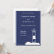 Um convite de casamento simples e elegante e azul de marinho com uma ilustração de um farol para um casamento de tema marinho e náutico!