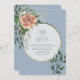 Este Elegante Convite Azul Pessoroso Pessegueiro combina pêssego mole e florescências cor-de-rosa com verde-luxuoso sobre um sofisticado fundo azul empoeirado. Acentuado com um quadro circular ouro, esse design é perfeito para casamentos primavera e verão, oferecendo um toque romântico e botânico. Ideal para casais que buscam uma mistura de elegância e beleza natural para seu dia especial.