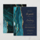 A borda esquerda deste elegante convite de casamento moderno apresenta uma coloração aquosa lacrimogênea aparada com uma falsa brilha de ouro. O texto personalizável combina manuscrito dourado, fontes em copperplate e itálico em um sofisticado fundo azul marinho. O verso apresenta um design de chaleira e de agata dourada.