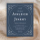 Este elegante convite de casamento emparelha uma bela fonte vintage com fonte sans serif. O texto branco é enquadrado por um fino oval rodeado por delicados motivos botânicos nos cantos, sobre fundo azul-indigo. O quadro é repetido no verso, com duas iniciais de monograma.