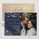 Apresentamos nosso convite de casamento elegante, rústico e inspirado em boho, projetado em tons sofisticados de rose gold e azul-marinho. Este convite completo apresenta luzes cintilantes, flores douradas vintage e uma foto pessoal do casal. Personalize facilmente com o site do seu casamento e inclua um código QR conveniente para RSVPs. Uma combinação perfeita de conveniência moderna e charme atemporal, este convite define lindamente o tom para o seu dia inesquecível.