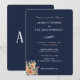 Convite azul escuro para casamentos, com flores de damasqueiro e folhagem de jardim. Um design botânico contemporâneo simples, mas elegante, inspirado pelo estilo boho vintage, com monograma no verso.