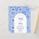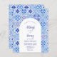Este design rústico apresenta um padrão de fundo de azulejos portugueses, azulejos, de cor azul e branca. Personalize-o com os nomes da noiva e do noivo em um roteiro de caligrafia azul e o texto remanescente em uma combinação de sans serif, copperplate e itálico em forma de arco branco. Um padrão de azulejo correspondente aparece no lado oposto.