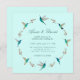 Este convite de casamento elegante apresenta uma grinalda em aquarela de beija-flores e ramos botânicos em um fundo turquesa claro. Ele pode ser personalizado para qualquer outra celebração, como um aniversário, festa de aniversário, festa de noivado, aposentadoria ou formatura. O tamanho e o estilo da fonte podem ser alterados clicando em "Editar usando a ferramenta de design". Todas as imagens de beija-flores são tiradas de aquarelas originais de C. Dobbins.
