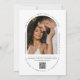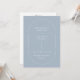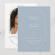 Este convite de casamento minimalista moderno e elegante apresenta um layout de arco estiloso com texto circular que diz "convida-se a participar na celebração do casamento de" elegantemente colocado no topo, adicionando um toque romântico e formal sobre um fundo azul poeirento. A fonte serifada sofisticada destaca os nomes do casal com uma aparência limpa e refinada. A parte de trás do cartão inclui espaço para uma foto pessoal do casal feliz e um código QR personalizável para que os convidados respondam e encontrem mais detalhes.