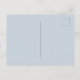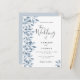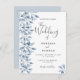 Um convite de casamento em branco e azul empoeirado. Um fundo branco chic na frente. Decorados com prigos e folhagem azuis botânicos. Escrita moderna e extensa, tipografia com o texto: O casamento de... Modelos para nomes próprios e detalhes do casamento. Texto das cinzas escuras. Fundo: fundo azul empoeirado. Dica: Se você não quiser que pareça um cartão postal, clique em personalizar, vá para o verso e remova o divisor e o carimbo de posto.