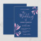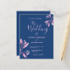 Um convite para casamento simples e moderno a rosa azul. Um fundo azul decorado com galhos e folhagem cor-de-rosa botânico. Escrita moderna e extensa, tipografia com o texto: O casamento de... Modelos para nomes e detalhes do casamento. Texto cor-de-rosa. Fundo: fundo azul. Dica: Se você não quiser que pareça um cartão postal, clique em personalizar, vá para o verso e remova o divisor e o carimbo de posto.