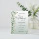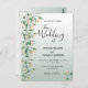À frente: Tema botânico. Gradiente verde sábio, fundo ombre. Decorados com verde, prigos e folhagem com flores de ouro pequeno. Escrita escrita em letras grandes modernas, tipografia com o texto: O casamento de. Modelos para seus nomes e detalhes do casamento. Texto preto. Voltar: plano de fundo verde sage. Dica: Se você não quiser que pareça um cartão postal, clique em personalizar, vá para o verso e remova o divisor e o carimbo de posto.