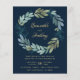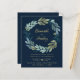 Você vai adorar este lindo design elegante de aquarela. Ele apresenta elementos florais de aquarela em um formato de grinalda circular. As cores incluem verde sage, azul poeirado em um fundo marinho. Todo o texto é em dourado e muito fácil de personalizar com seus próprios detalhes.