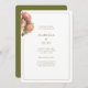 Moderno e trendy com um toque vintage. Este adorável convite de casamento apresenta um buquê de acentos de rosas voluptuosas contra fundos brancos e verdes oliva chiques. O conjunto de fontes contemporâneas exala uma elegância moderna e sofisticada. Personalize com o site do casamento e detalhes de RSVP no verso.