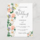 Um convite de casamento floral em branco, coral e pêssego. Um fundo branco chic na frente. Decorados com flores grandes e peludas, florais em branco, coral e pêssego. Escrita moderna e extensa, tipografia com o texto: O casamento de... Modelos para seus primeiros nomes e detalhes do casamento. Texto das cinzas escuras. Fundo: fundo colorido de coral.