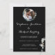 Flower Wreath Black White Convite De Casamento De Foto. Uma coroa simples e elegante melhorada com a foto do casal no centro. Flores brancas cercadas por uma coroa azul sobre fundo preto com texto branco. Exiba seu estilo exclusivo com este convite de casamento de caligrafia de script. Compartilhe sua foto romântica com seus parentes e amigos. Personalize com seus detalhes de casamento.