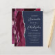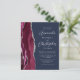 A borda esquerda deste convite de casamento moderno e elegante apresenta uma borda de ágata em vermelho burgundy com acabamento em brilho prateado falso. O texto personalizável combina fontes script e sans serif em cinza prateado sobre um fundo azul marinho. O verso apresenta um design de ágata burgundy e prata correspondente.