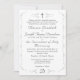 Design apresenta um texto de cor prateada sobre um fundo branco. Uma cruz prateada aparece no centro superior, enquanto que o monograma dos casais é apresentado na parte inferior. O texto é escrito em formato católico tradicional. Uma fronteira elegante rodeia design. A parte traseira apresenta um fundo de cor prateada. Um florescimento elegante é fotografado no centro da design. O monograma do sobrenome é exibido acima, enquanto o verso bíblia da escolha é mostrado logo abaixo. Também disponível em cor-de-rosa champanhe.
