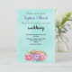 Um convite de casamento elegante e romântico. Um lindo buquê de flores de aquarela composto por peônias rosa, anêmonas roxas e tulipas laranja, rodeado por folhas verdes, sobre uma textura suave de aquarela verde menta.