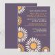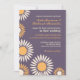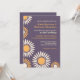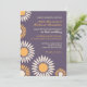 Convite de casamento com fundo roxo e padrão de girassóis brancos e amarelos. Você está planejando um casamento na primavera ou verão com lindas flores por toda parte? Então, talvez este seja o cartão perfeito para você. Personalize as palavras e as fontes para se adequar ao seu gosto. Visite minha loja para mais variações deste design em cartão de "Salve a Data", etiqueta de endereço e mais.