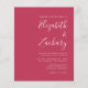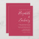Este convite de casamento moderno simples apresenta texto branco em um fundo rosa magenta. Adicione os nomes da noiva e do noivo em caligrafia elegante e os detalhes em fonte sans serif. O verso fornece espaço para detalhes do casamento em um fundo magenta sólido, juntamente com um código QR que os convidados podem escanear para visitar seu site e confirmar presença. NOTA: Os envelopes não estão incluídos automaticamente com esses convites econômicos, então por favor lembre-se de escolher a opção "envelopes brancos"!