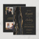 A borda esquerda deste convite de casamento moderno e elegante apresenta uma borda de ágata em aquarela preta aparada com brilho dourado falso. O texto personalizável combina escrita à mão em cor dourada, fontes copperplate e itálico em um fundo preto-claro. O verso fornece espaços para 4 fotos (1 quadrada, 2 horizontais, 1 vertical longa) e espaço para o URL do seu site de casamento ou outras informações. OBSERVAÇÃO: Os envelopes não estão incluídos automaticamente com esses convites econômicos, então, por favor, lembre-se de escolher a opção "envelopes brancos"!