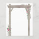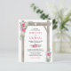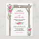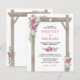 Convites de casamento econômicos com um fundo branco simples que pode ser alterado para qualquer cor, uma exibição floral em aquarela rosa e branca em um arco de casamento de madeira rústica, um coração esculpido com as iniciais do casal e um modelo de casamento elegante editável.