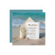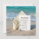 Um cartão de vazio e um envelope descansam em uma praia arenosa cercada por conchas, estrelas-do-mar, e um fundo oceânico turquesa para um convite de casamento. Todo o texto pode ser alterado. A cor de fundo no lado inverso pode ser alterada.