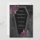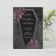 Escuro e lindo, este convite de casamento em forma de caixão é perfeito para um casamento gótico ou de Halloween. O caixão tem brilho de glitter prateado em torno das bordas e rosas arroxeadas com folhas verdes douradas e cinzas. As linhas nas bordas do convite são um toque agradável. O fundo é uma aquarela preta sombria que faz o caixão e as flores realmente se destacarem.