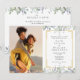 Um convite de casamento elegante e completo com a sua foto especial e folhas de salvia e lilás que caem sobre uma moldura dourada elegante que envolve os detalhes do seu casamento em texto clássico e elegante. O verso tem o site do seu casamento e detalhes de RSVP e código QR. Projetado por Thisisnotme©