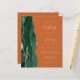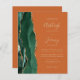 Economize no custo de impressão e envio de cartões RSVP separados com este convite de casamento econômico, moderno e elegante, tudo em um. A borda esquerda apresenta uma borda de ágata em aquarela esmeralda aparada com brilho falso dourado. O texto personalizável combina escrita à mão em dourado, fontes copperplate e itálico em um fundo laranja queimado ou ferrugem. O verso fornece espaço para detalhes do casamento, juntamente com um código QR que os convidados podem digitalizar para visitar seu site e responder.