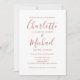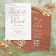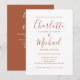 Inclui nomes em estilo de assinatura, este convite de casamento em terracota pode ser personalizado com todos os detalhes do casamento na frente, informações do site de casamento e código QR no verso. Desenhado por Thisisnotme©