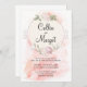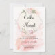 Bela coroa floral com fundo rosa e rosas brancas e rosadas para o seu convite de casamento. Fácil de personalizar. Party Parti PH © Mais designs disponíveis em nossa loja.