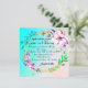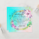 Um fundo pastel azul-esverdeado brilhante e bege suave mostrando flores vibrantes rosa e roxo sombreado em lados opostos da coroa com alguns ramos verdes jogados para contraste. Dentro da coroa estão os detalhes do casamento em fontes elegantes. Elegante e simples